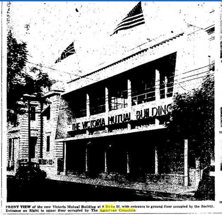 The American Consulate General was located on the first floor at 6 Duke Street, the Victoria Mutual Building Society headquarters, from the early 1900s. A Gleaner article from September 1952, on the VMBS building, shows the US flag flying over the building. In the 1940s, during World War II, refugees staying at Gibraltar Camp as well as Italians previously interned in the Male Internment Camp adjacent to Up Park Camp military headquarters, flooded the consulate with applications for visas to the United States. The Consulate moved in 1960 to 43 Duke Street where it remained until Jamaica gained independence.